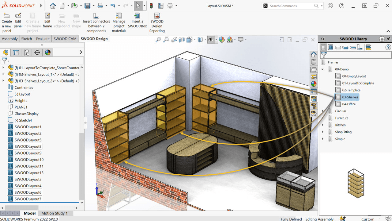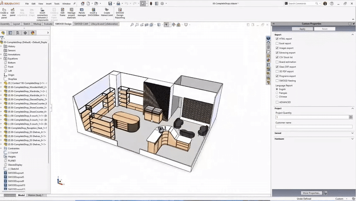 Verwalten Sie Multi-Material-Projekte mit den holzspezifischen, in SOLIDWORKS integrierten Funktionen von SWOOD. Fügen Sie Funktionen, komplexe Skizzen, 3D-Elemente wie Beleuchtungs- und Metallkomponenten und Glasböden in einer einzigen Umgebung ein.