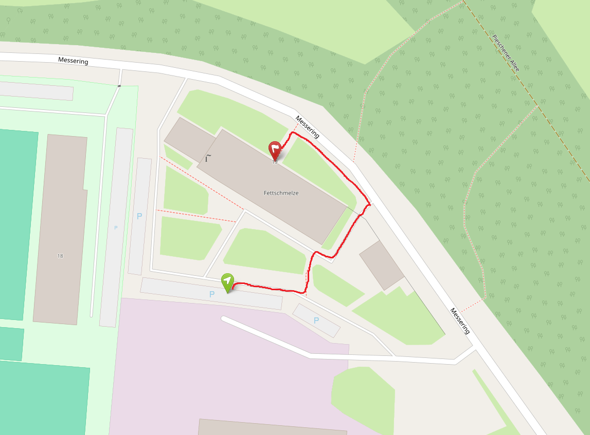 Wenn Sie mit dem Auto anreisen, können Sie den Parkplatz auf der südlichen Seite des Gebäudekomplexes nutzen (grüner Pin). Von dort aus folgen Sie dem Fußweg entlang der markierten Route (rote Linie) bis zum Haupteingang. Dieser befindet sich im selben Gebäude wie die „Fettschmelze“ (roter Pin).