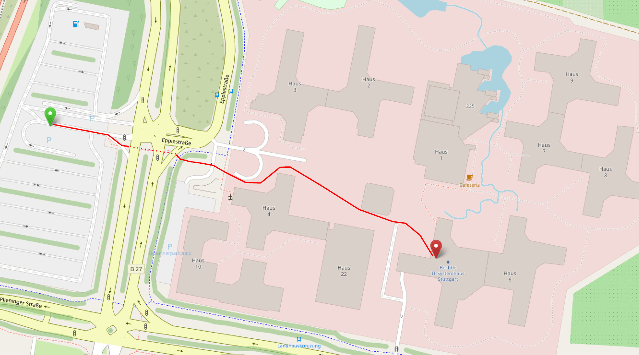 Falls Sie mit dem Auto anreisen, steht Ihnen ein großer Parkplatz (Epplestr. 303) zur Verfügung. Von dort orientieren Sie sich in Richtung Epplestraße (rote Linie), um über die Straße oder durch die Unterführung auf den Campus Sternhöhe Möhringen zu kommen. Auf dem weitläufigen Gelände gehen Sie rechts vom großen Gebäude mit der Glasfront auf den gekennzeichneten Bechtle Eingang in Haus 5 zu (roter Pin).