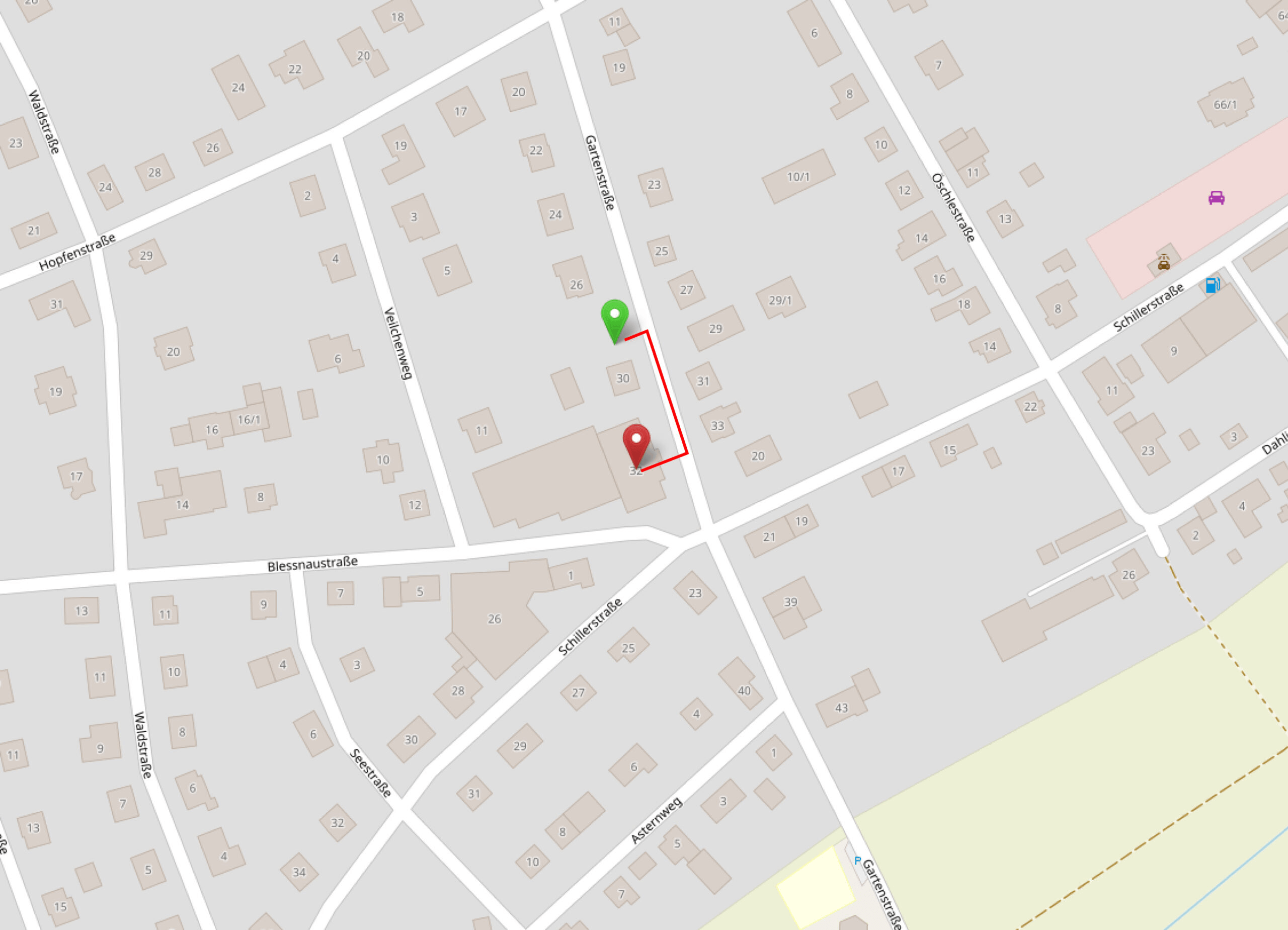 Wenn Sie mit dem Auto anreisen, steht Ihnen ein großzügiger Kiesparkplatz zur Verfügung (grüner Pin). Von dort aus führt der Weg entlang der Gartenstraße in südlicher Richtung (rote Linie). Der Haupteingang befindet sich nach kurzer Gehzeit auf der rechten Seite und ist gut sichtbar (roter Pin).