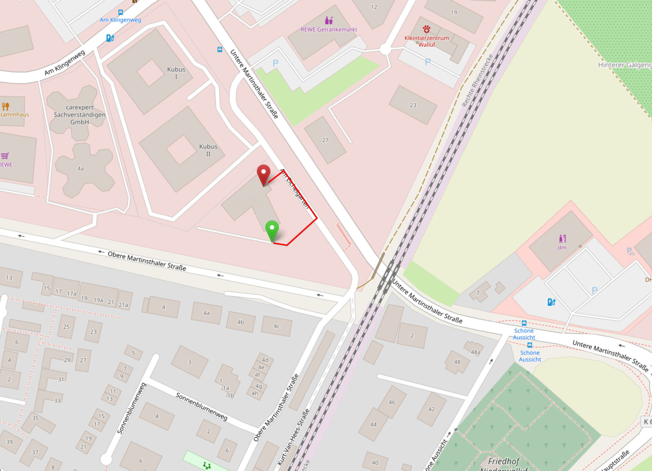 Falls Sie mit dem Auto anreisen, steht Ihnen hinter dem Gebäude ein Parkplatz (grüner Pin) zur Verfügung. Fahren Sie von „u. Martinsthaler Str.“ auf „Am Eichelgarten“ und biegen Sie links auf das Gelände unserer Geschäftsstelle ab. Von diesem kommen Sie problemlos (rote Linie) in das anliegende Gebäude (roter Pin).
