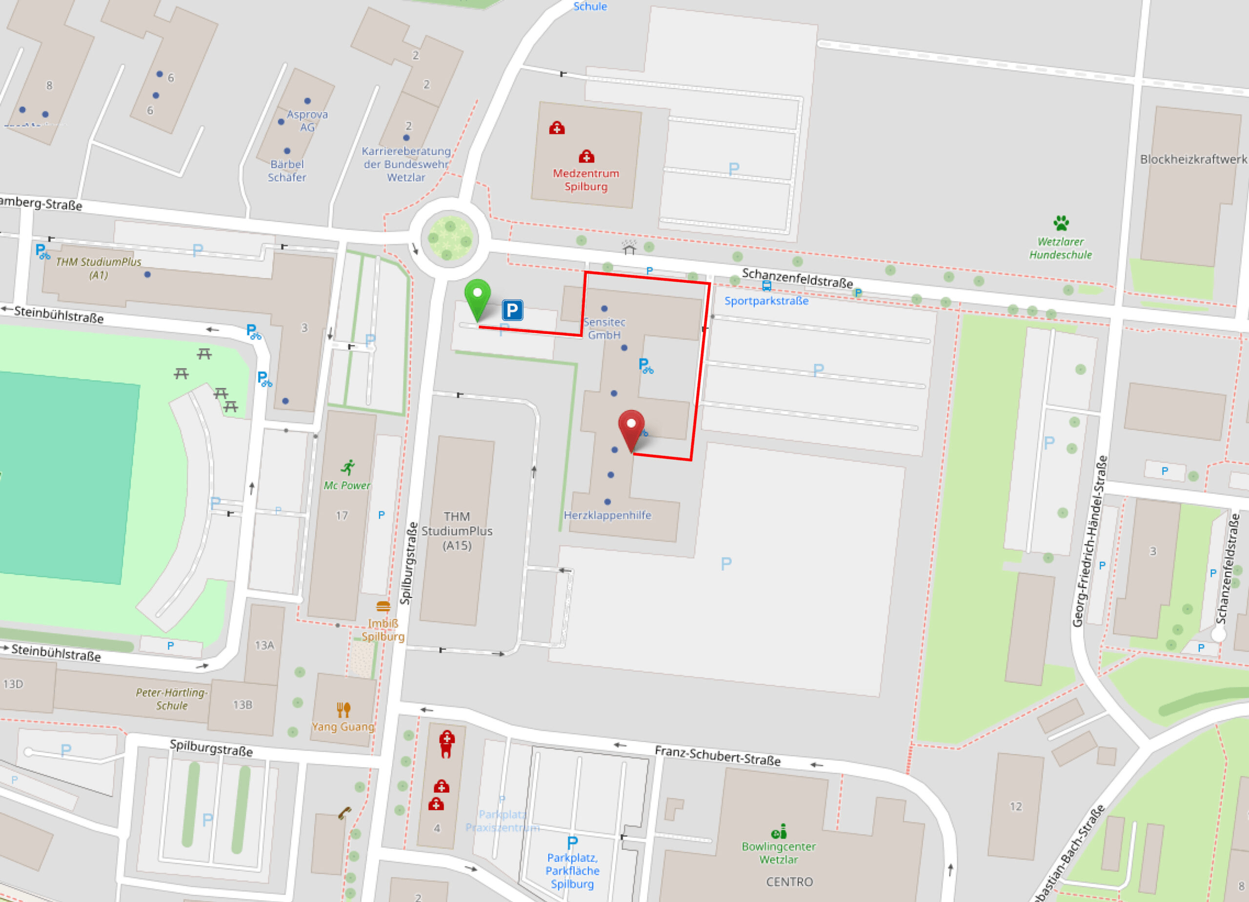 Wenn Sie mit dem Auto anreisen, steht Ihnen ein großzügiger Parkplatz hinter dem Gebäude zur Verfügung (grüner Pin). Von dort aus kann entweder die Vorderseite des Gebäudes angesteuert oder direkt der gut sichtbare Haupteingang auf der Parkplatzseite genutzt werden (roter Pin).