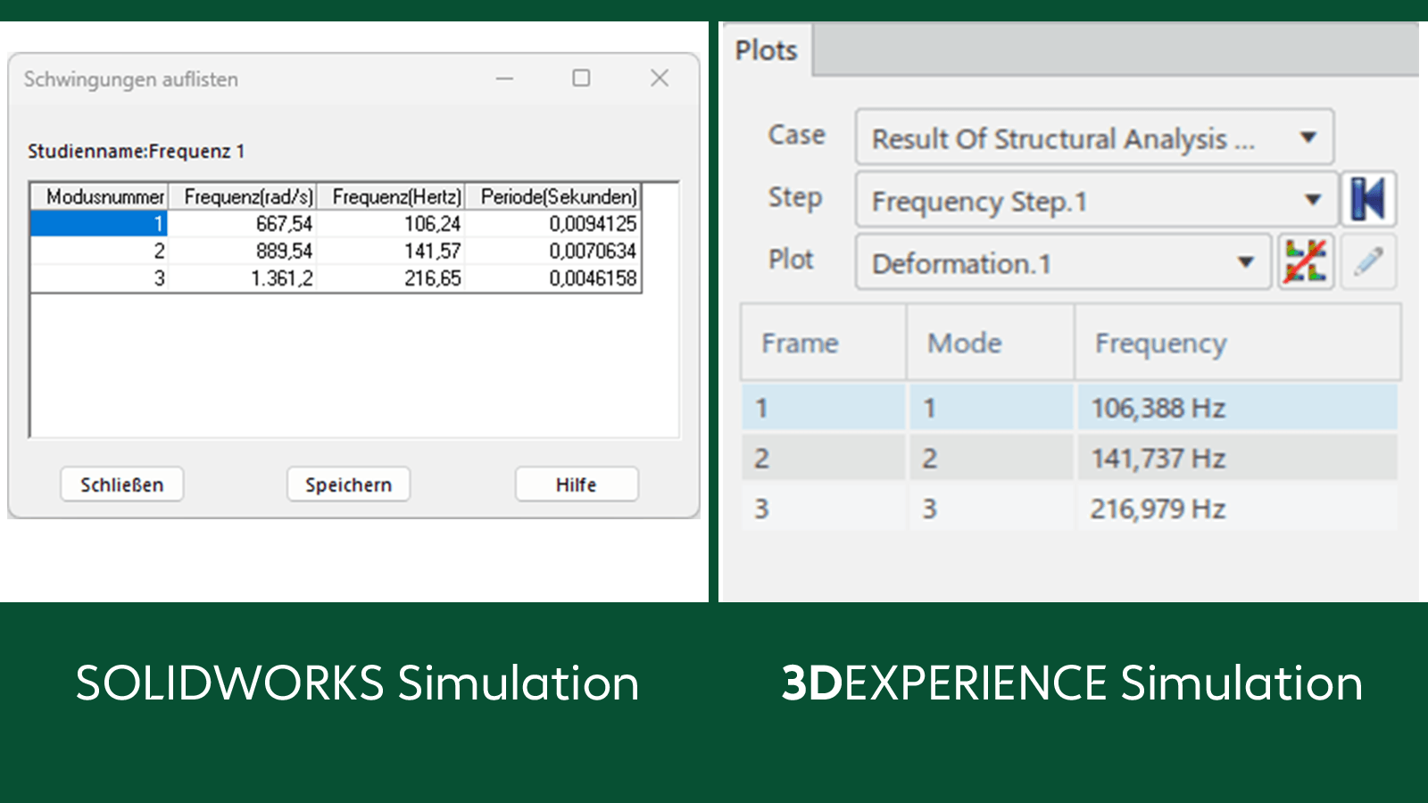 Abbildung 3a und 3b. Erste drei Eigenfrequenzen SOLIDWORKS vs. 3DEXPERIENCE Simulation.