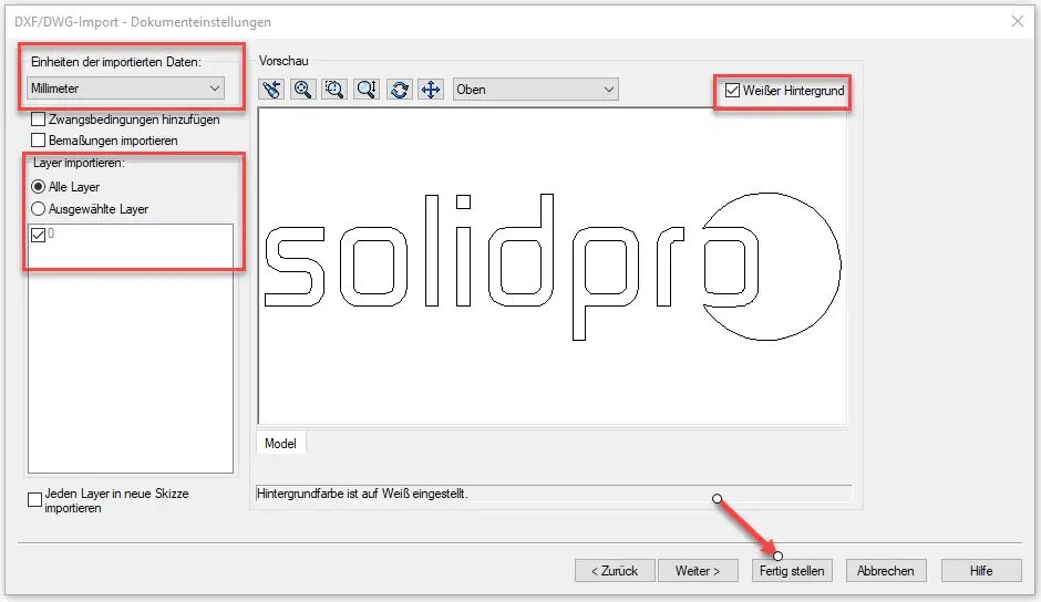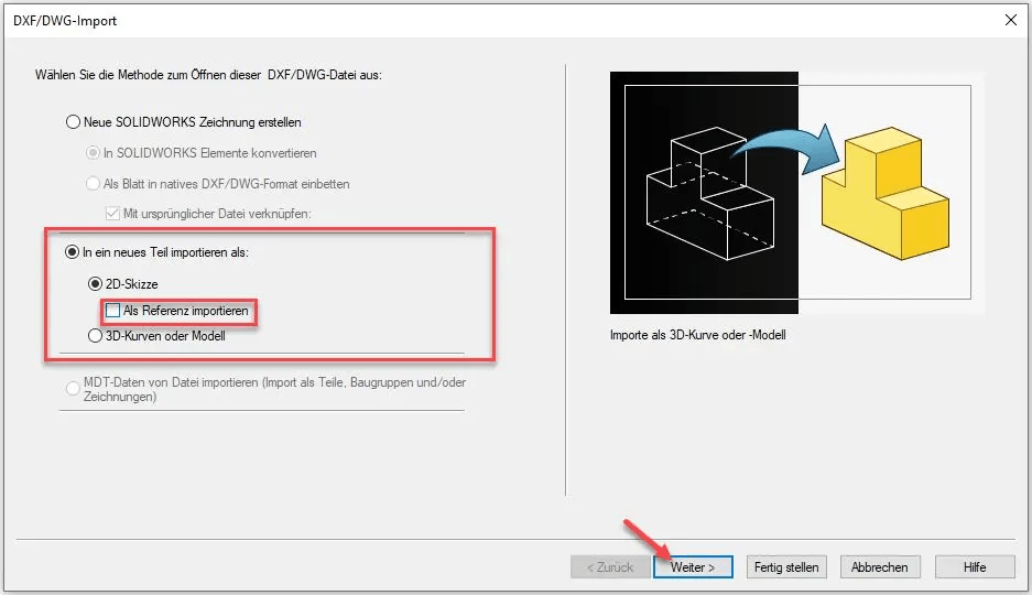 Weiter geht es mit der DXF-Datei. In SOLIDWORKS öffnen Sie die DXF-Datei mit diesen Einstellungen: In ein neues Teil importieren als -> 2D-Skizze und OHNE Als Referenz importieren.