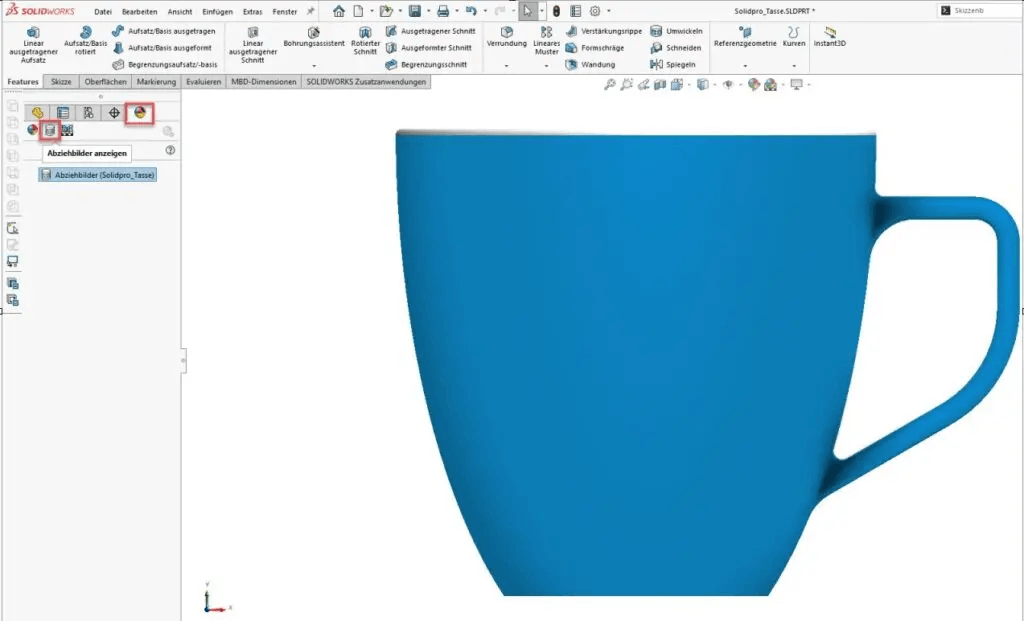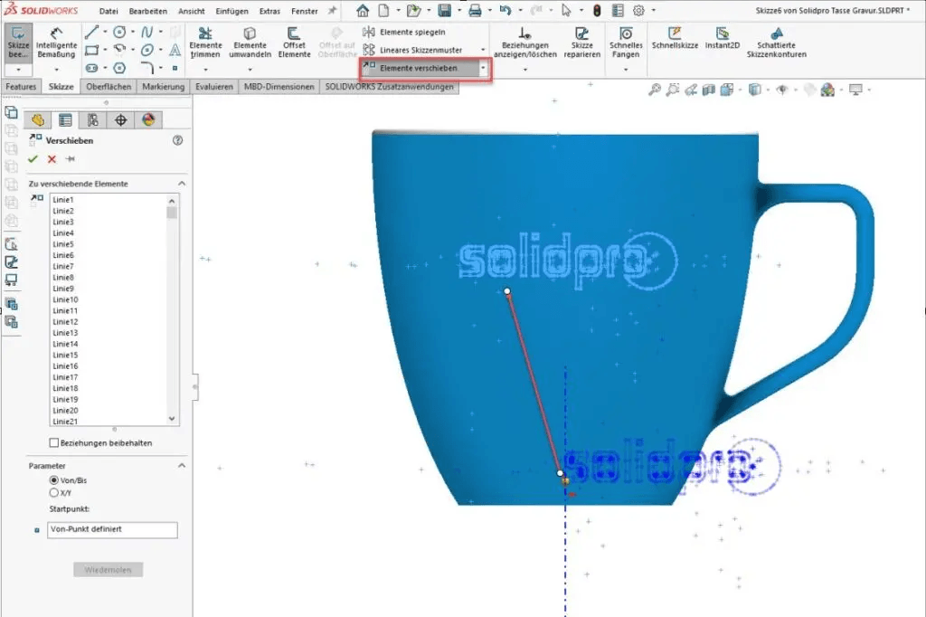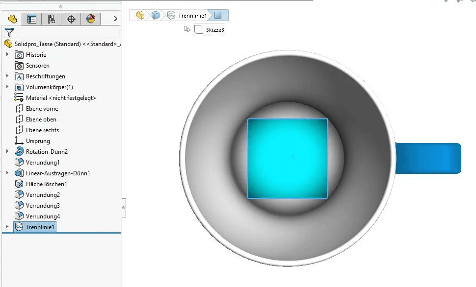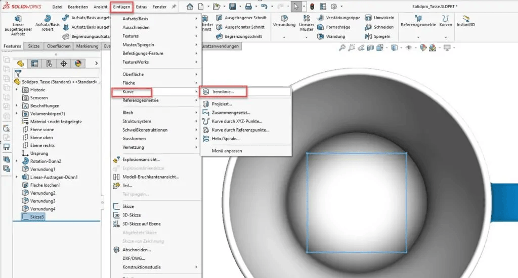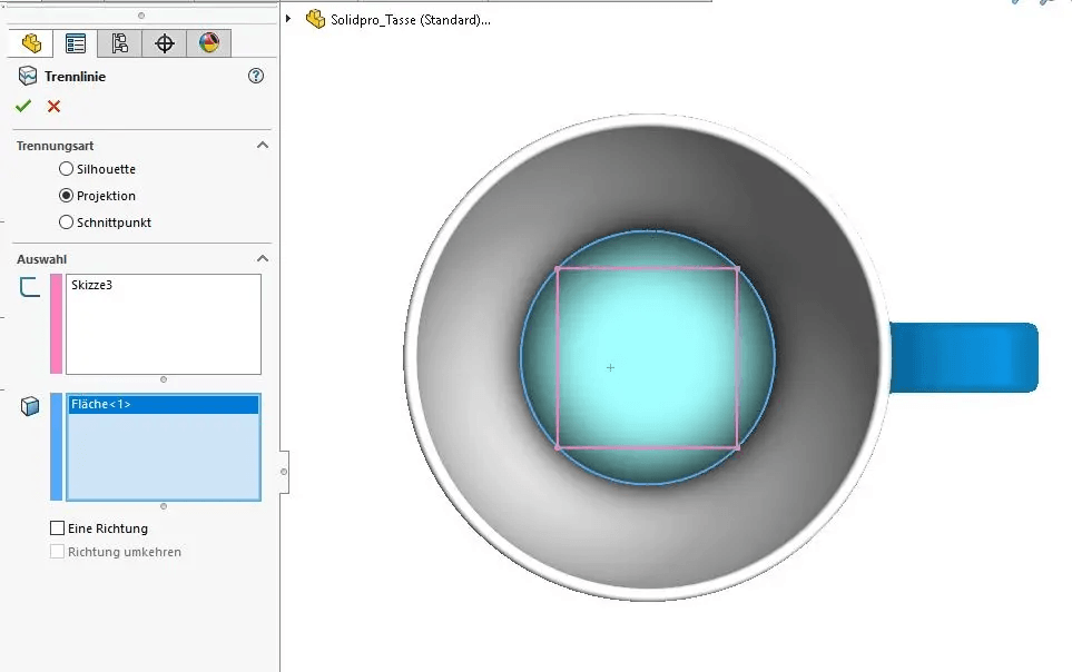 Für die Gravur auf unserer Tasse fügen wir die Skizze in das Tassen-Modell ein.
