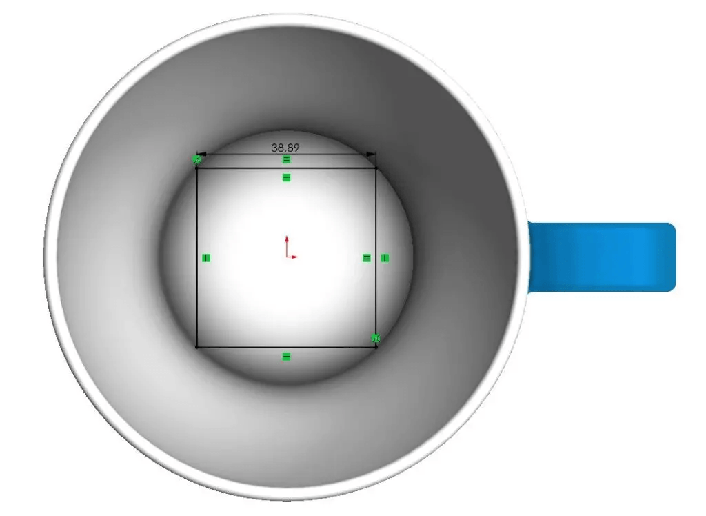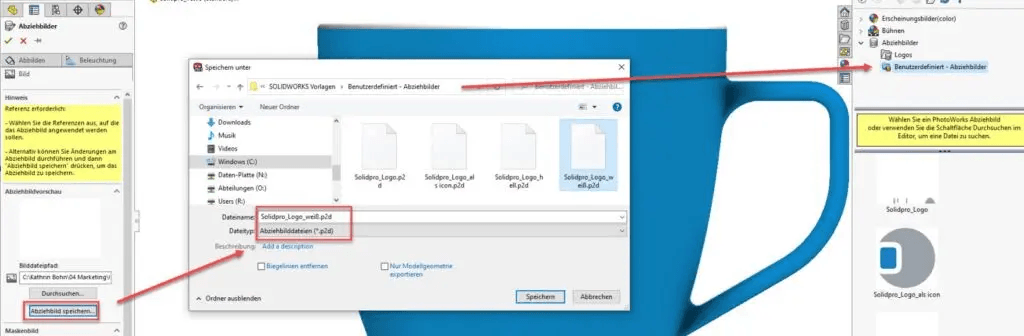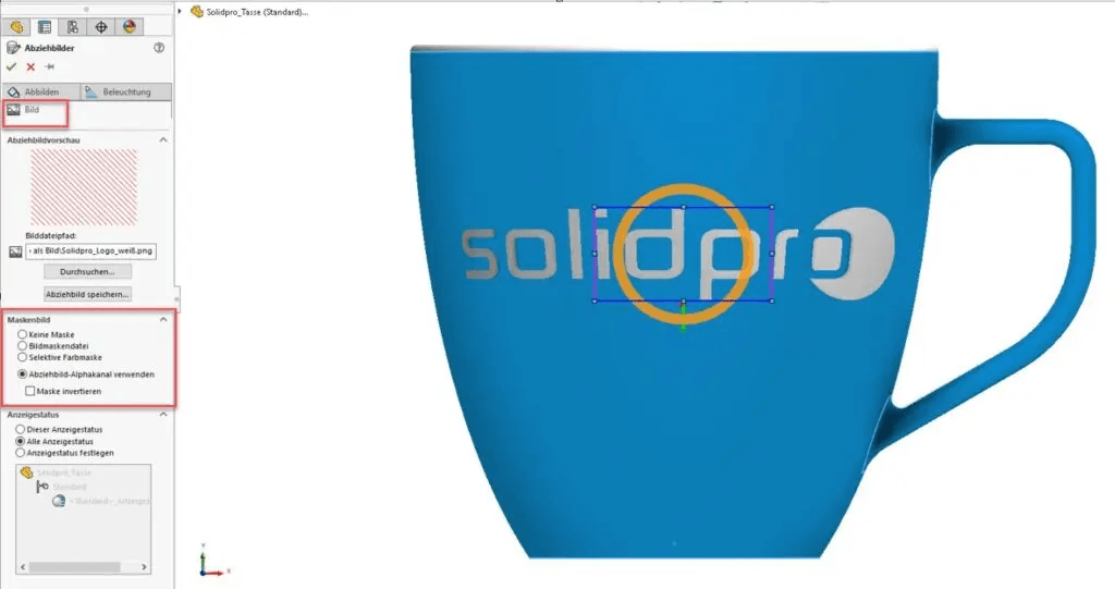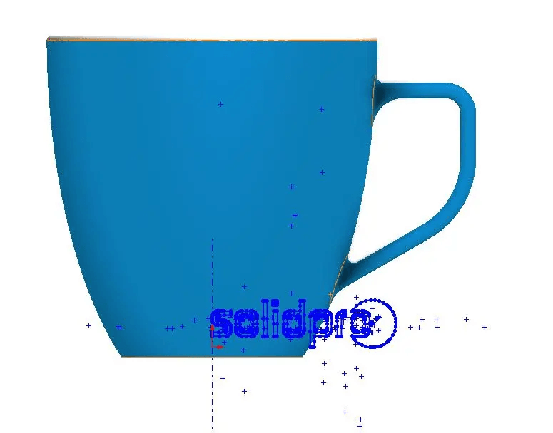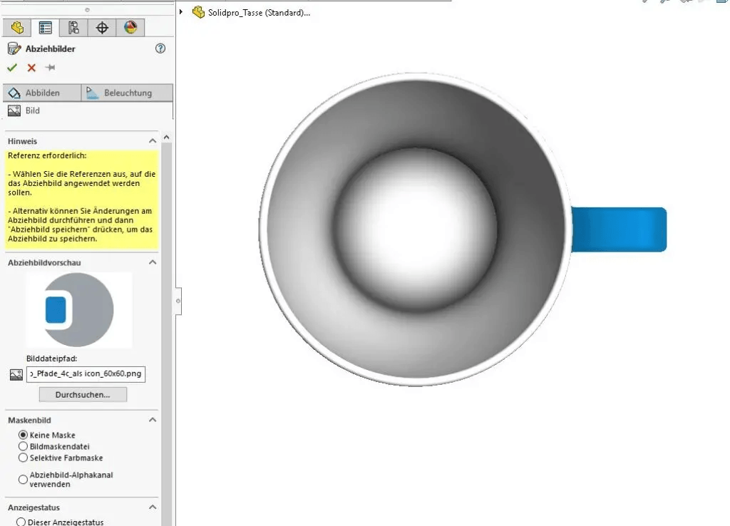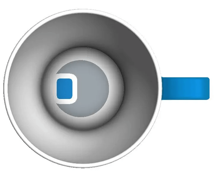 Um ein Logo / Bild besser auf einer Fläche zu positionieren, empfiehlt es sich, eine Hilfskonstruktion zu verwenden. Dies kann eine Konstruktionslinie oder ein Bereich sein, in dem das Logo dann platziert wird. Dies geht natürlich auch im Nachhinein. In diesem Beispiel wird nun im Tassenboden ein Bild eingefügt und an einem gezielten Bereich ausgerichtet.