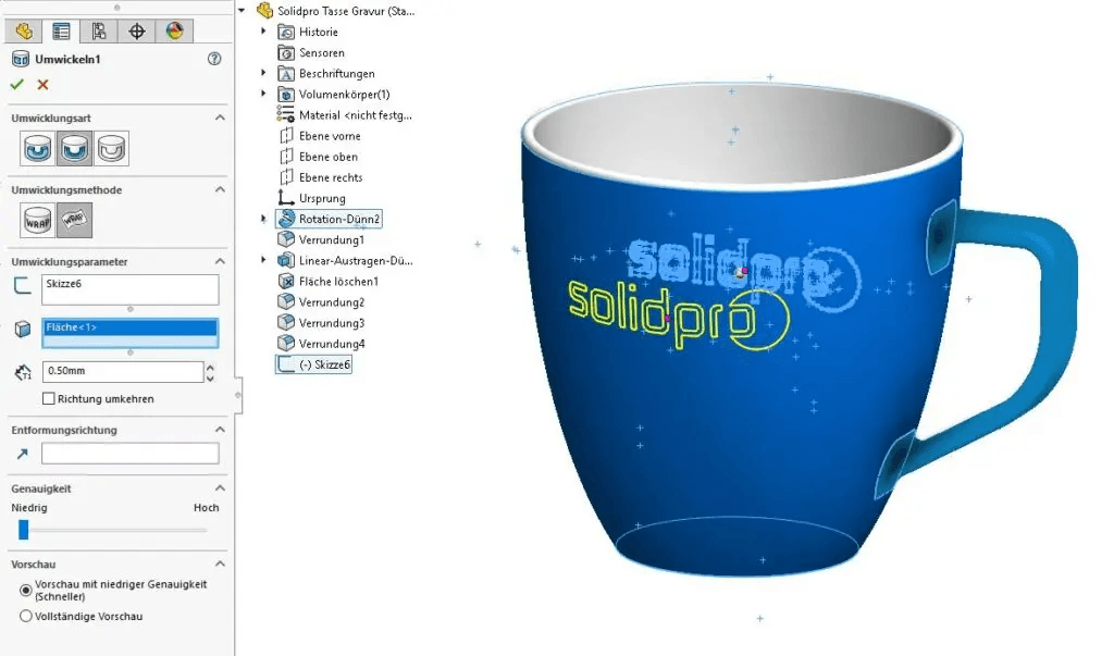 Schließlich wenden Sie die Skizze auf das Feature Umwickeln an. Nehmen Sie diese Einstellungen vor: Umwicklungsart -> Einprägen, Umwicklungsmethode -> Wrap und definieren Sie Ihre Umwicklungsparameter.