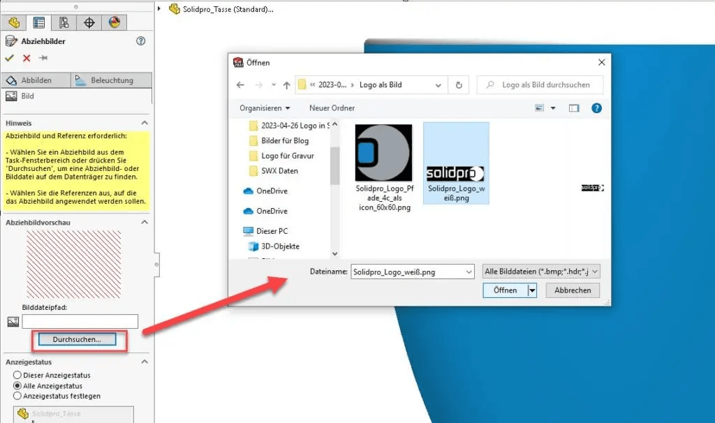 Es öffnet sich der PropertyManager zum Abziehbild. Falls Ihr Bild schon als Abziehbild angelegt wurde, können Sie es direkt auswählen. Sie können aber auch auf jede beliebige Bilddatei zugreifen. Klicken Sie dazu auf Durchsuchen. Wählen Sie Ihr Logo und klicken dann auf Öffnen.