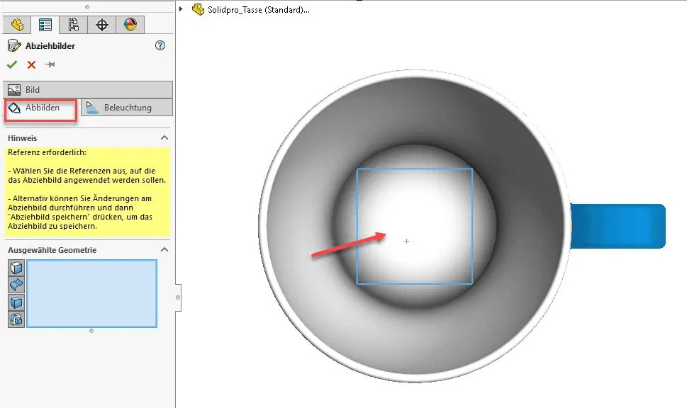 Nun platzieren wir das Bild. Wechseln Sie im PropertyManager zum Bereich Abbilden und wählen dann im Modell eine Fläche, auf der das Bild eingefügt werden soll.