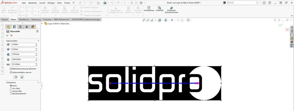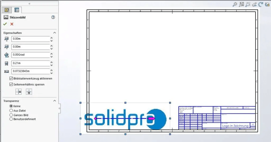Das Logo/Bild wird in die Skizze eingefügt und es öffnet sich der PropertyManager zum Skizzenbild. Über die Eigenschaften können Sie die Größe und Ausrichtung verändern. Auch über das Bildskalierungswerkzeug können Sie Ihr Logo modifizieren.