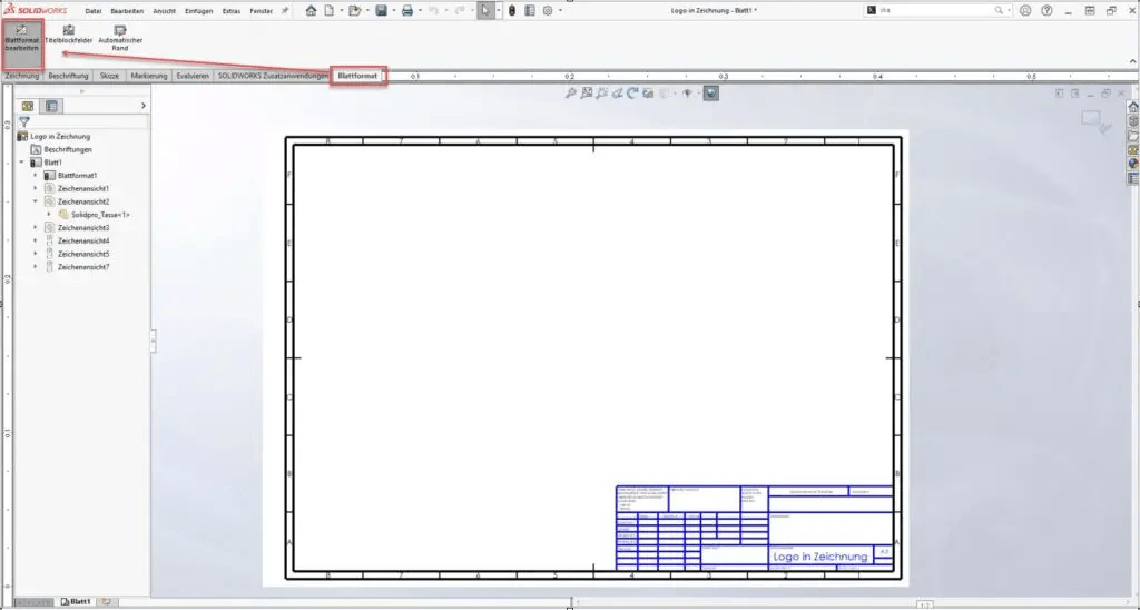 In der Zeichnung wechseln Sie zum Blattformat und Blattformat bearbeiten.