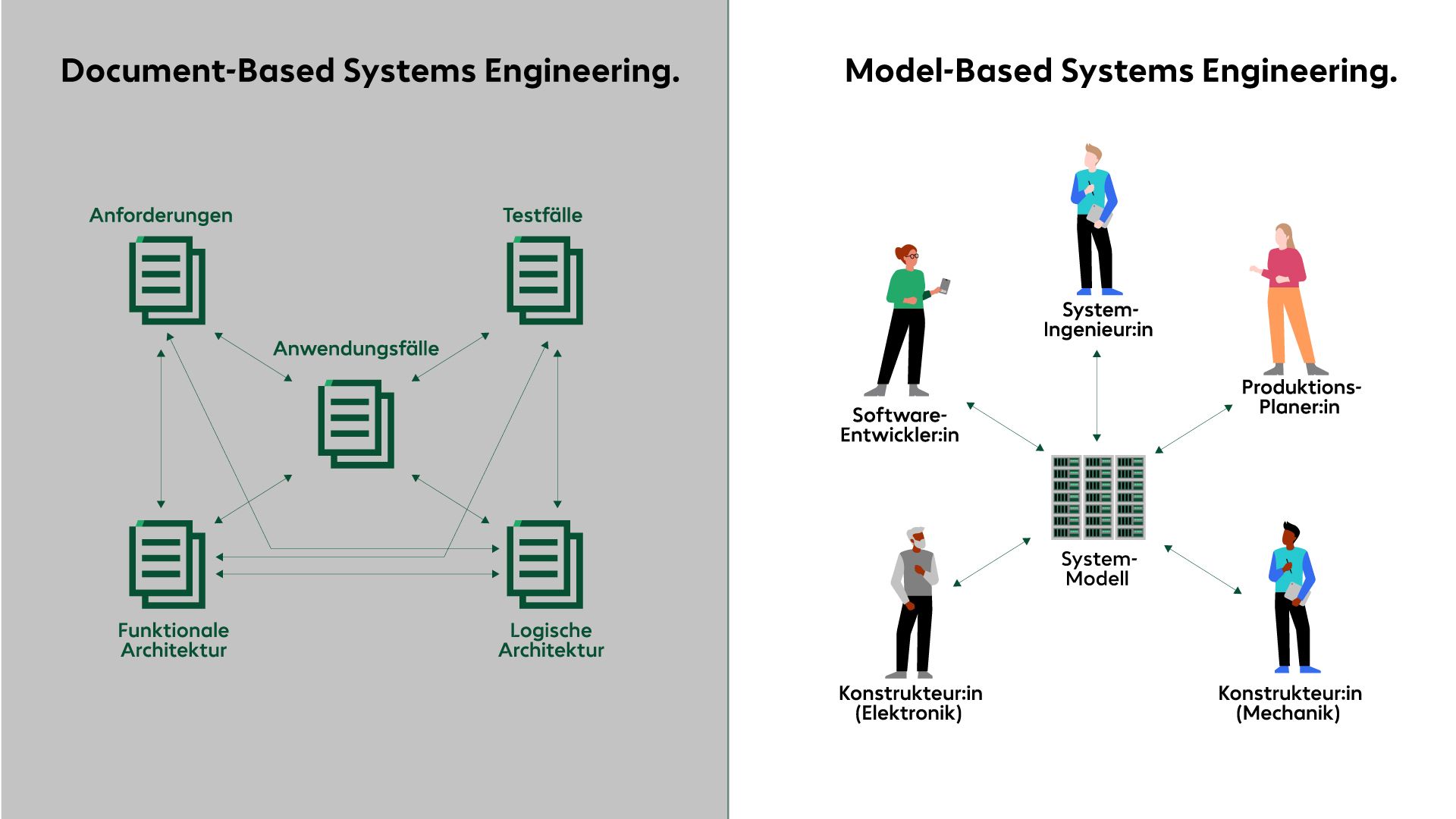 Traditionell werden Systeme über eine Vielzahl von Dokumenten beschrieben: Lasten- und Pflichtenhefte, Spezifikationen, Zeichnungen, Excel-Listen, Präsentationen. Jede Abteilung pflegt eigene Stände, oft mit eigener Terminologie. Änderungen werden per E-Mail kommuniziert. Die Folge: