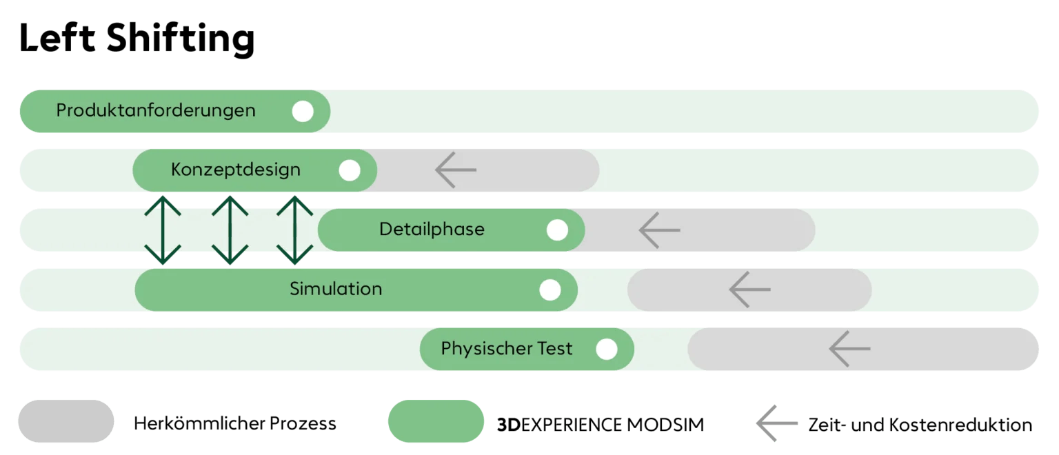 Kurz gesagt: MODSIM integriert die Simulation vollständig in den Produktentwicklungsprozess. Es ist nicht „Simulation nach der Konstruktion“, sondern „Simulation beim Konstruieren“. Die Simulation ist nicht mehr nachgelagert, sondern rückt zeitlich weiter nach vorn, oder bildlich gesprochen: Sie und alle nachgelagerten Prozesse befinden sich auf der Zeitachse weiter links. Im Fachjargon spricht man im Zusammenhang mit MODSIM daher auch vom „Left-Shifting“.