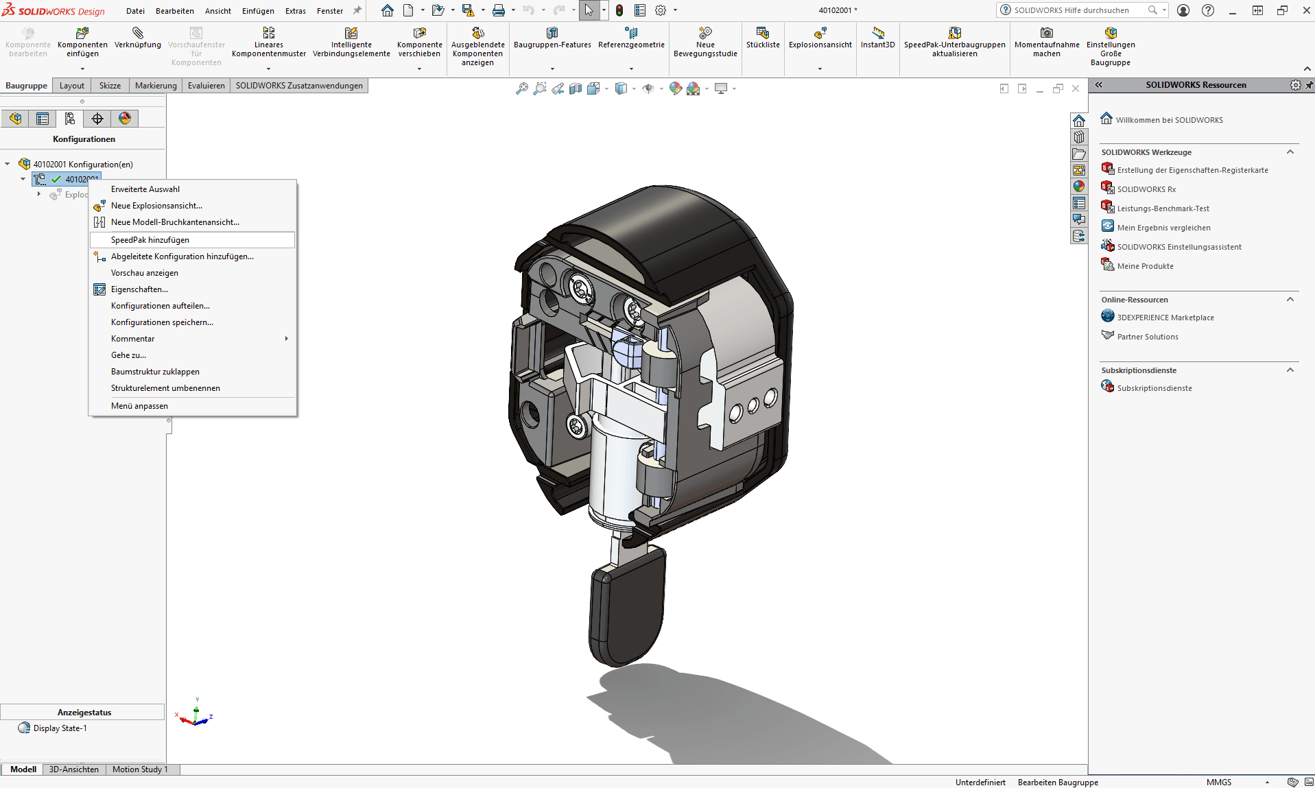 Rechtsklicken Sie auf die Konfiguration und wählen Sie „SpeedPak erstellen“. Mit einem Klick auf „OK“ erstellt SOLIDWORKS dann eine SpedPak-Konfiguration.