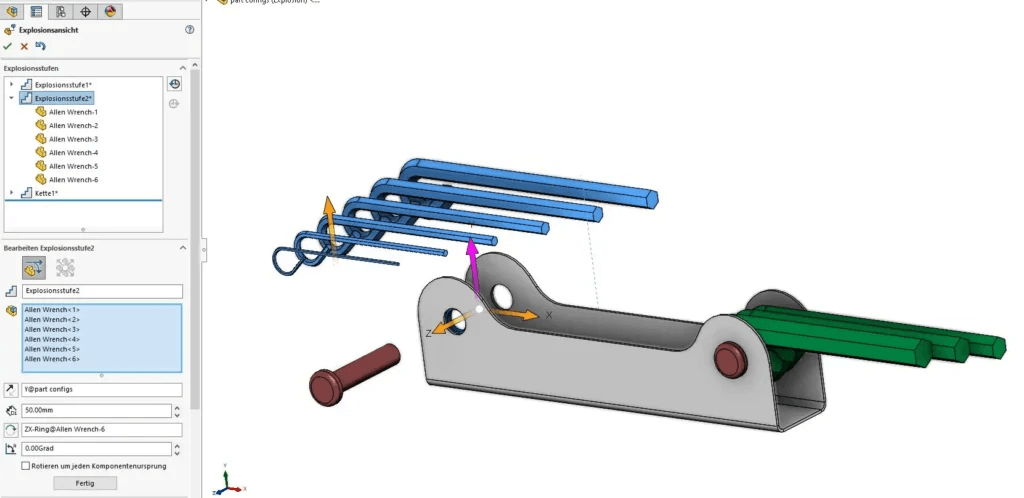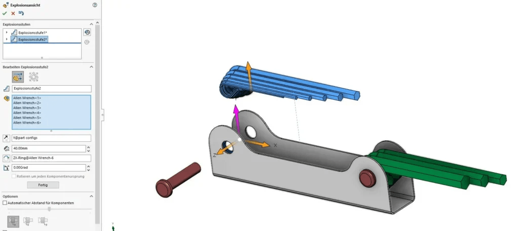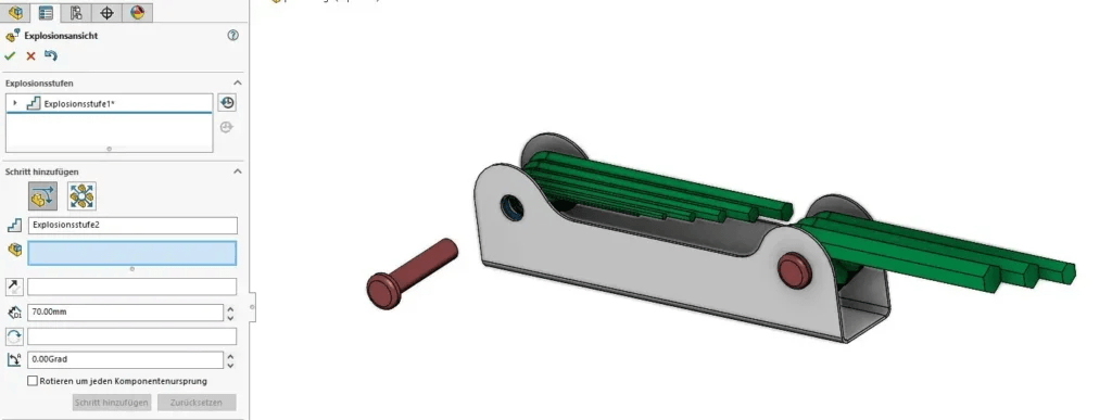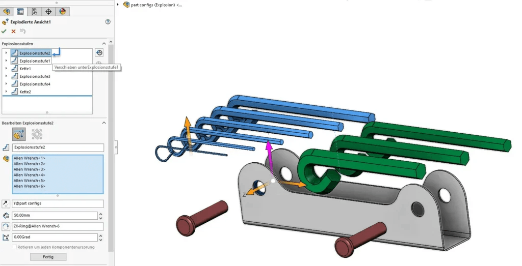 Um eine komplette Explosionsansicht des Modells zu erstellen, wird diese Vorgehensweise mehrfach wiederholt. Dabei ist wichtig, dass Sie oben im FeatureManager erst auf OK klicken, wenn alle Explosionsstufen erstellt wurden.