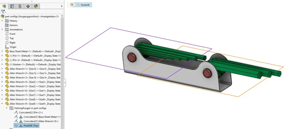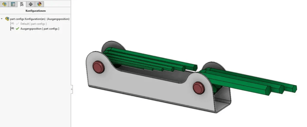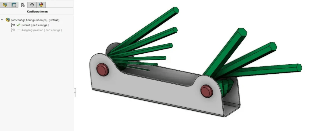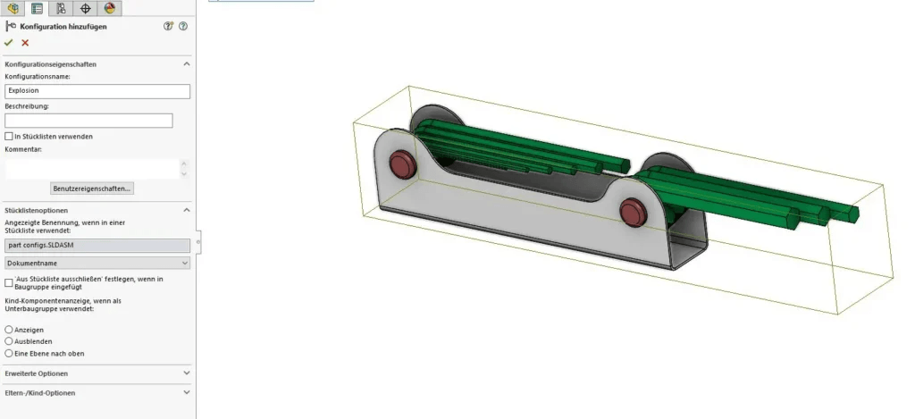 Da Explosionsansichten mit der aktiven Konfiguration gespeichert werden, empfiehlt es sich, eine Konfiguration als Ausgangsposition für die Explosion zu erstellen. Der Vorteil besteht darin, dass Sie nun eine optimale Startposition zum Zerlegen Ihrer Baugruppe haben und einfach zwischen den Konfigurationen hin und herwechseln können.