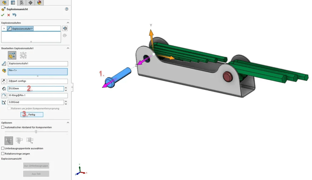 Im PropertyManager Explosionsansicht werden alle Explosionsstufen erstellt und gespeichert.