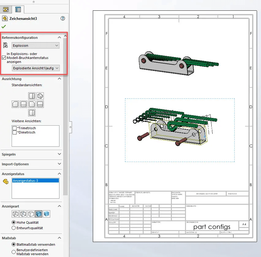 Sie können auf der Zeichnung ganz leicht die Explosion Ihres Modells abbilden. Voraussetzung ist natürlich, dass auf Modellebene eine Konfiguration mit der Explosion erstellt wurde. Im PropertyManager der Zeichenansicht unter Referenzkonfiguration einfach die Konfiguration der Explosion auswählen und den Haken setzen bei “In Explosions- oder Modell-Bruchkantenstatus anzeigen”.