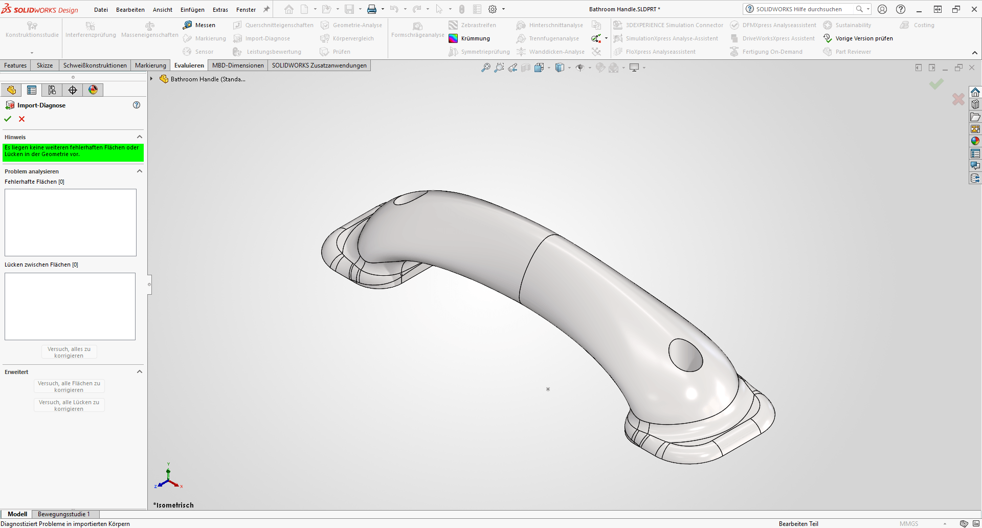 Nach dem Import ist der erste Schritt das Ausführen der Import-Diagnose, um Fehler in der Geometrie zu finden und zu bereinigen. In dem gezeigten Beispiel gibt es eine fehlerhafte Fläche, die mit der Importdiagnose identifiziert und repariert werden kann. Eine Datei, die Fehler enthält, sollte nicht verwendet werden, da diese im weiteren Verlauf der Konstruktion zu Problemen führen können: Teile werden nicht korrekt dargestellt, Modelle können nicht geladen werden, Lade- und Neuaufbauzeiten werden deutlich länger, um nur einige zu nennen.