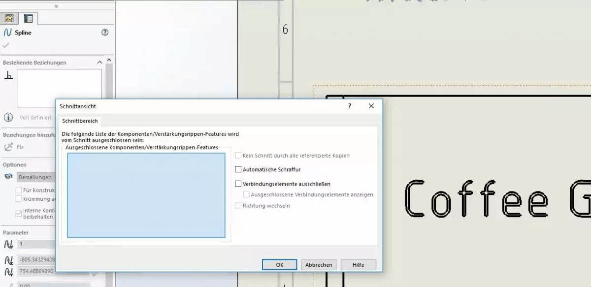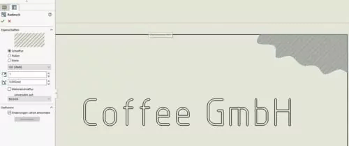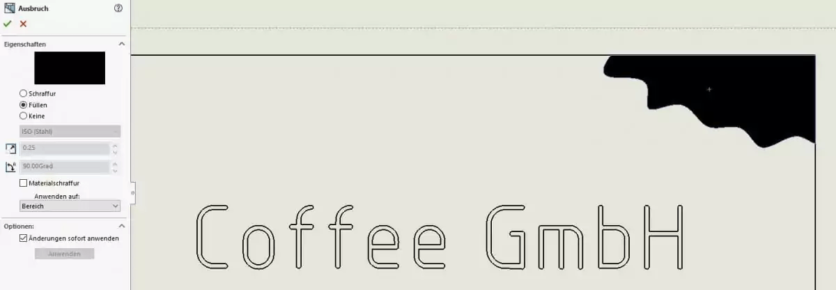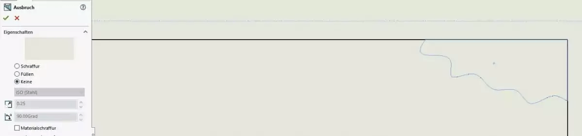 Wenn dies der Fall ist und Ihnen die Schraffur nicht zusagt, selektieren Sie mit der Maus die Schraffur und Sie bekommen im Feature-Manager die Einstellungsoptionen für beispielsweise diesen Ausbruch angezeigt.