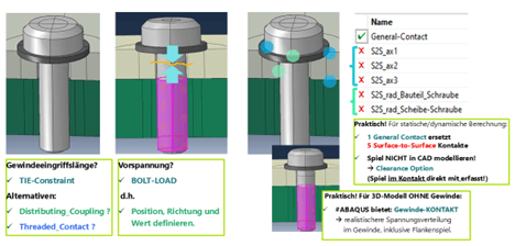 - Drei Strategien für Gewindeeingriff: TIE-Constraint (schnell, starr), Distributed Coupling (weich, lastverteilend) oder Single-threaded bolt contact (präzise, berücksichtigt Flankenspiel und Spannungsverteilung in Gewindegängen).