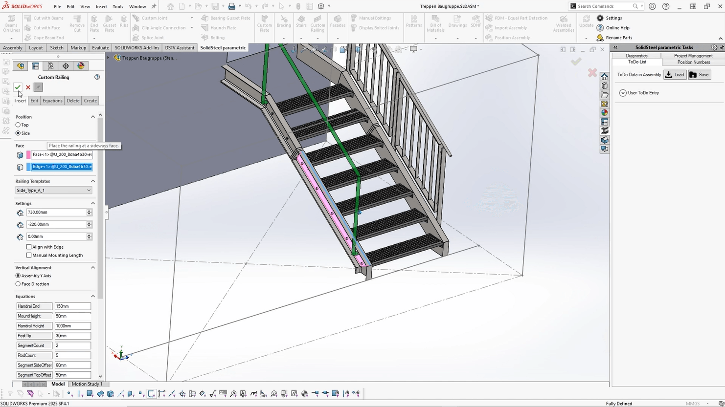 Eine Treppe ohne Geländer wäre nicht nur unvollständig, sondern auch nicht normgerecht. Umso erfreulicher ist es, wie reibungslos SolidSteel parametric auch diesen Teil abdeckt. Der Workflow ist klar strukturiert: Sie wählen eine Montagefläche, definieren die Richtung über eine Kante, und die Software erzeugt sofort eine einfache Vorschau.