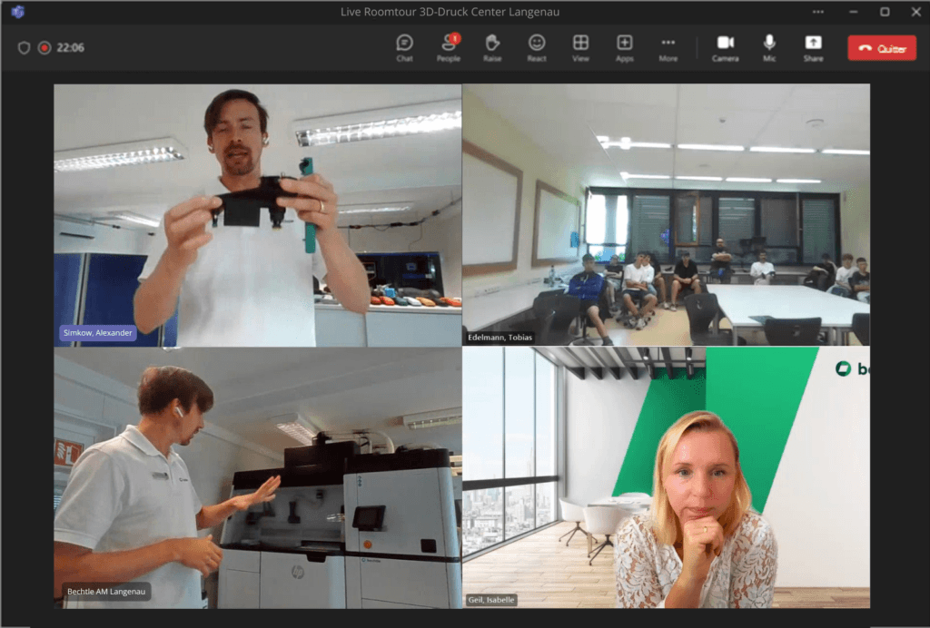 Ein weiteres Highlight: eine virtuelle Roomtour durch den Showroom der Bechtle Additive Manufacturing Deutschland in Langenau. Alexander Simkow, 3D-Druck Solution Consultant, führte die Klasse live per Online-Meeting durch verschiedene 3D-Druckverfahren, erklärte Materialien, Drucktechnologien und Preisspannen – praxisnah, anschaulich und spannend. Zusätzlich konnten reale 3D-Druck-Modelle im Klassenzimmer begutachtet werden.