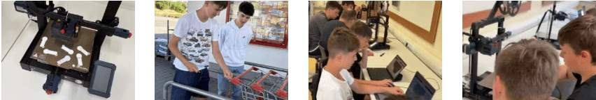 Am dritten Tag begann die Produktion – und brachte erste echte Rückschläge mit sich. Die schuleigenen 3D-Drucker mussten gewartet werden, erste Bauteile erfüllten nicht alle Anforderungen. Auch der Praxistest am Einkaufswagen – organisiert als kleine „Dienstfahrt“ zum Supermarkt – brachte Klarheit: Der MONEYSAVER passte nicht exakt, er war etwas zu hoch. Die Konsequenz: zurück an die PCs, Redesign, Neudruck.