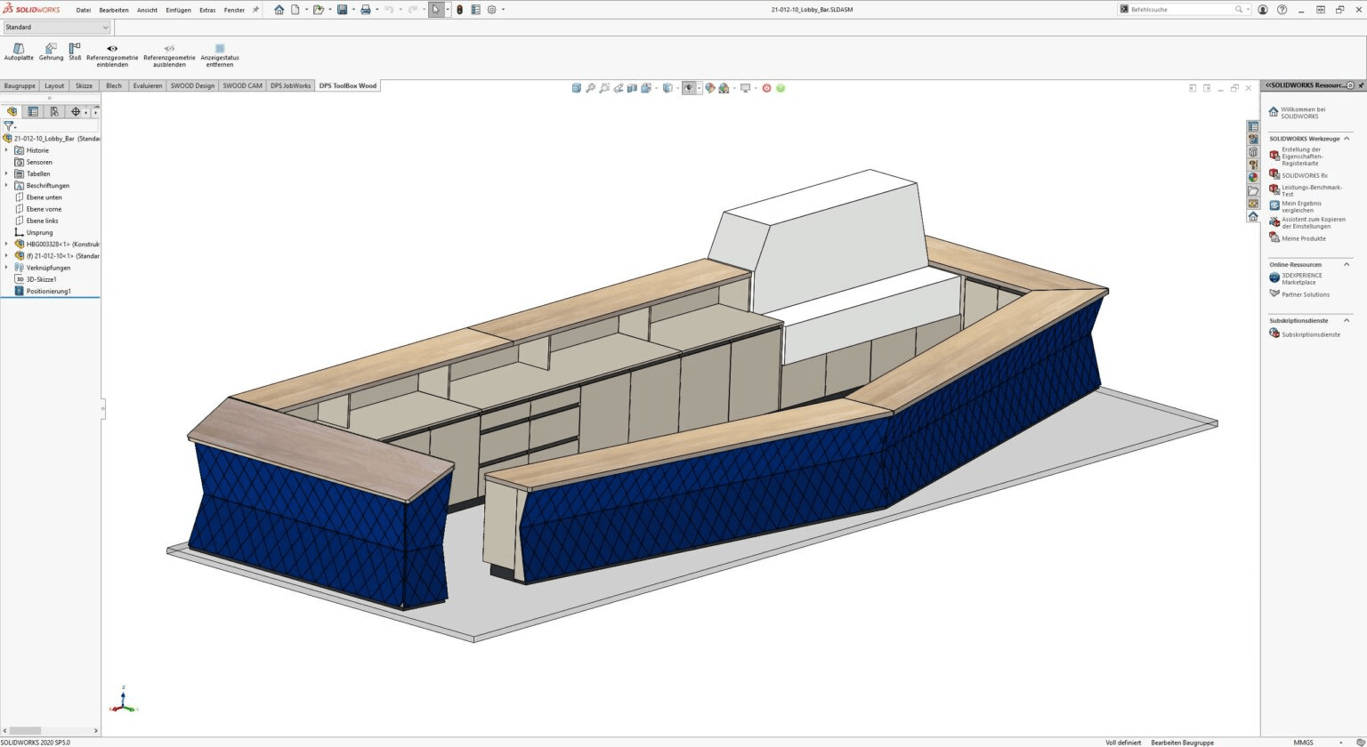 Im Umfeld von Frankfurt konnte das damals junge Unternehmen gut wachsen. Man liefert aber auch weit über diesen Raum hinaus, etwa nach Berlin, Zürich, Luxemburg oder sogar nach Paris. „Zu unseren Kunden zählen Banken, Versicherungen und Unternehmen aus den unterschiedlichsten Branchen der Industrie, aber auch Kultureinrichtungen wie Museen und sogar Privatpersonen.“ Gearbeitet wird oft auf der Basis von Plattenmaterial. Die Platten werden gesägt und erhalten weitere Bearbeitungen. Danach gibt es eine Oberflächenbearbeitung und schließlich die Kantenleimung. Am Schluss kommt die Montage. Natürlich müssen alle Möbel, dann auch die Einzelteile entworfen werden. Das machen hier Schreiner mit IT-Erfahrung und Weiterbildung als Technischer Zeichner, die sich nach Entwürfen von Architekten, ggf. Designern und Bauherren richten. Dafür wird seit 2020 bei Gebr. Jung die Branchenlösung SWOOD eingesetzt. Das System kommt aus Frankreich und ist eine Ergänzung zu SOLIDWORKS. SOLIDWORKS ist das am weitesten verbreitete 3D-CAD-System und eine perfekte Lösung für den Innenausbau, da hier auch Funktionen für andere Materialien wie Blech, Glas oder Kunststoff zur Verfügung stehen. Diese Anforderungen werden im Bereich Innenausbau immer mehr benötigt. Ein reiner Korpusgenerator ist nicht mehr ausreichend.