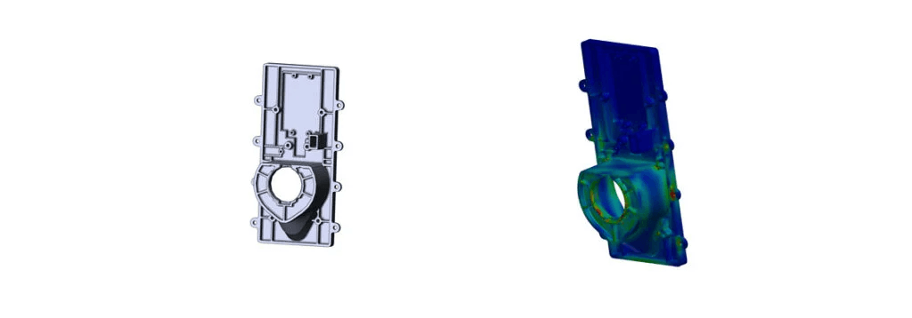 Eine ganze Reihe von Auswertungen zeigt den Verlauf der Formfüllung ebenso wie den Temperaturverlauf, aber auch speziellere Abläufe wie die Scherspannungen, denen das Kunststoffmaterial während des Füllens ausgesetzt ist. Rassbichler erläutert: „Bei ungünstiger Auslegung kann sich das Material durch die Spannung so erhitzen, dass es verbrennt. Mit Hilfe von SOLIDWORKS Plastics können wir heute die Optimierungsphasen einer kompletten Werkzeugkonstruktion sehr schnell durchlaufen.“ Genauso schwierig ist es, den Verzug des Bauteils nach dem Entformen abzuschätzen. SOLIDWORKS Plastics berechnet den Verzug genau und zeigt diesen je nach Bedarf realistisch oder stark überhöht. Auch die Konstrukteure nutzen die Spritzgusssimulation, um schnell eine Aussage zum Verzug zu bekommen und diesen in ihrer Arbeit zu berücksichtigen. So kann der Konstrukteur noch vor dem Formenbau entsprechend entgegenwirken, beispielsweise durch Versteifungsrippen oder entsprechendes Gegenbiegen der Form, so dass das Bauteil durch den Verzug erst gerade wird.