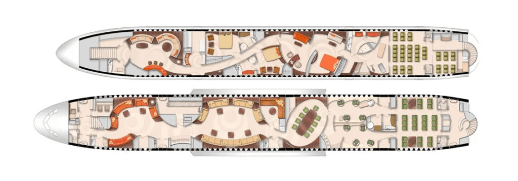 Da auch in einem solchen Flugzeug jedes Kilogramm Gewicht wertvoll ist, sind die Lufthansa Techniker wahre Meister des unsichtbaren Leichtbaus. So werden die angesprochenen Marmorverkleidungen aus einer hauchdünnen Marmorplatte mit einer Sandwichkonstruktion dahinter aufgebaut. Schwere Möbel lassen sich ebenfalls mit einem hohlen Innenleben und einer furnierten Oberfläche verwirklichen. Wichtig dabei ist, dass das Interieur in jedem Fall eine Belastung in Höhe der 16-fachen Erdbeschleunigung aushalten muss, damit das Flugzeug zugelassen wird – da werden dann schon einmal Möbelstücke mit sehr dünnen Beinen direkt an der Wand verschraubt, die Füße sind dann nur noch Designelemente.