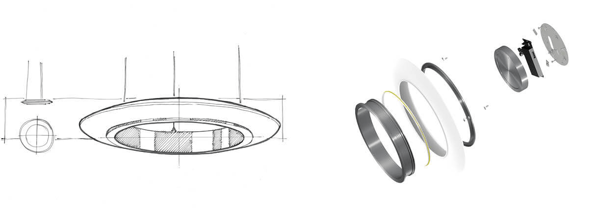 „Alles beginnt mit und in SOLIDWORKS“, sagt Dr.-Ing. Sergio Drawert. Und tatsächlich entstehen schon sehr früh im Entwicklungsprozess erste Detail- und Grobskizzen im CAD-System. Designerin Lisa Dorsch ergänzt: „Nach den ersten Handskizzen gehen wir sehr schnell in SOLIDWORKS, unter anderem, um die Proportionen möglichst von vornherein richtig zu sehen.“ Dorsch arbeitet selbst in SOLIDWORKS und kann so ihre Designs genau nach ihren Vorstellungen umsetzen. Bei RZB arbeiten bei der Neuentwicklung einer Leuchte zwei Bereiche Hand in Hand: auf der einen Seite die Designer, die sich um das Äußere der Leuchte kümmern, auf der anderen Seite die Lichtdesigner, deren Aufgabe es ist, die Lichtabstrahlung der neuen Lampe zu optimieren. Dazu nutzen sie das in SOLIDWORKS integrierte OptisWorks, mit dessen Hilfe sich der Strahlengang im Reflektor und das Lichtbild beziehungsweise der Lichtkegel der neuen Leuchte berechnen lassen. Gerade bei den neuen LED-Leuchten ist dies sehr wichtig, um ein angenehmes, blendfreies Abstrahlverhalten zu erzielen.